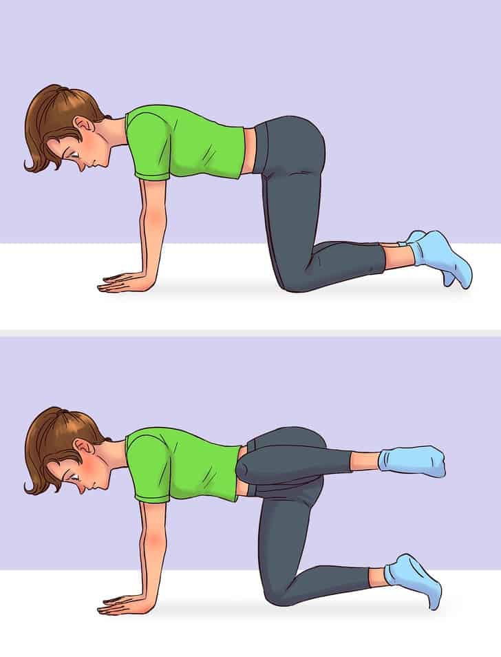 Ręce powinny znajdować się pod barkami, a kolana poniżej bioder. Trzymaj plecy prosto z ugiętymi kolanami. Lewą nogę odsuwamy na bok, mniej więcej na wysokości bioder. Wracamy do pozycji wyjściowej. Zmieniamy nogi i powtarzamy ćwiczenie przez około minutę.