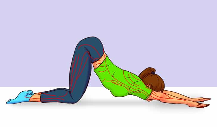 Połóż kolana na ziemi, a następnie pochyl się do przodu tak, aby dłonie dotykały podłogi. Trzymaj kolana zgięte, a głowę pod kątem, tak aby podbródek dotykał podłoża. Szyja powinna być rozluźniona. Łokcie nie powinny dotykać podłoża. Pozycja ta powinna być utrzymywana przez około jedną minutę.