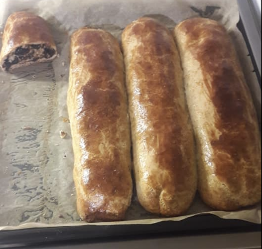 Na blaszce połóż papier do pieczenia, na który wyłóż zawinięte ciasto. Posmaruj je rozbełtanym jajkiem. Nagrzej piekarnik do 180 stopni. Piecz ciasto około 25 minut.