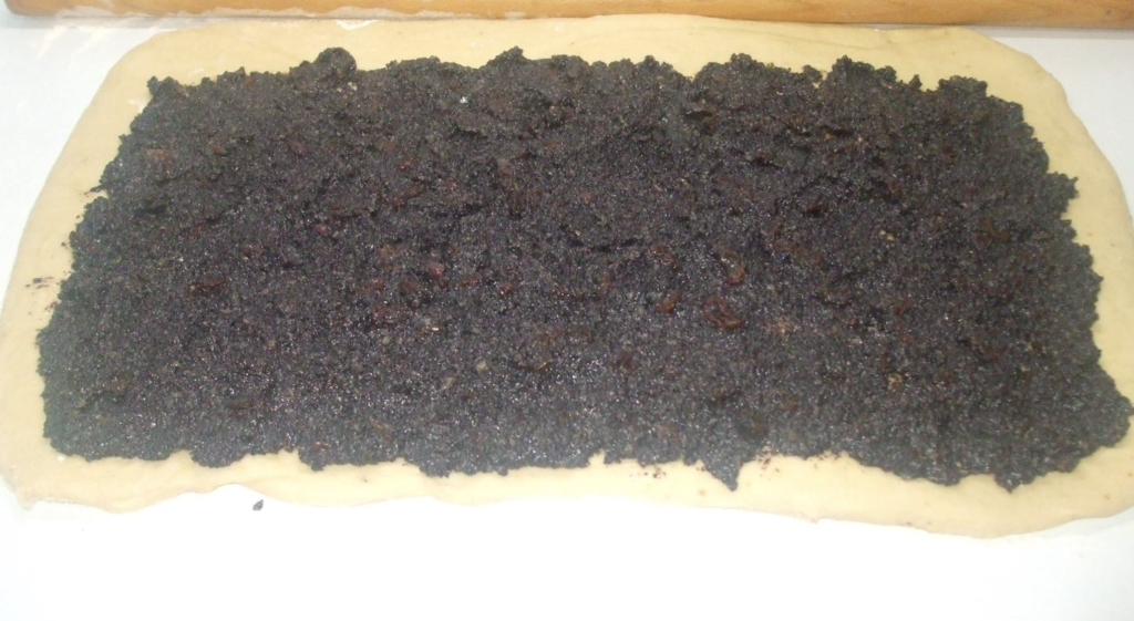 Do osobnej miski przełóż mielony mak i wymieszaj go z cukrem pudrem. Można lekko dosłodzić do smaku. Rozwałkowane ciasto posmaruj olejem i wyłóż na nie masę makową. Następnie nałóż starte jabłka. Krawędzie ciasta lekko zagnij i zawiń ciasto w rulonik i lekko nakłuj widelcem.