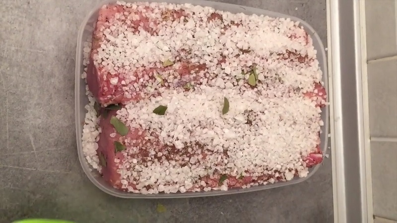 Włożyć je do pojemnika i posypać solą z każdej strony, a potem przełożyć do lodówki na 2 dni, aby mięso przeszło marynatą. Regularnie obracać mięso.