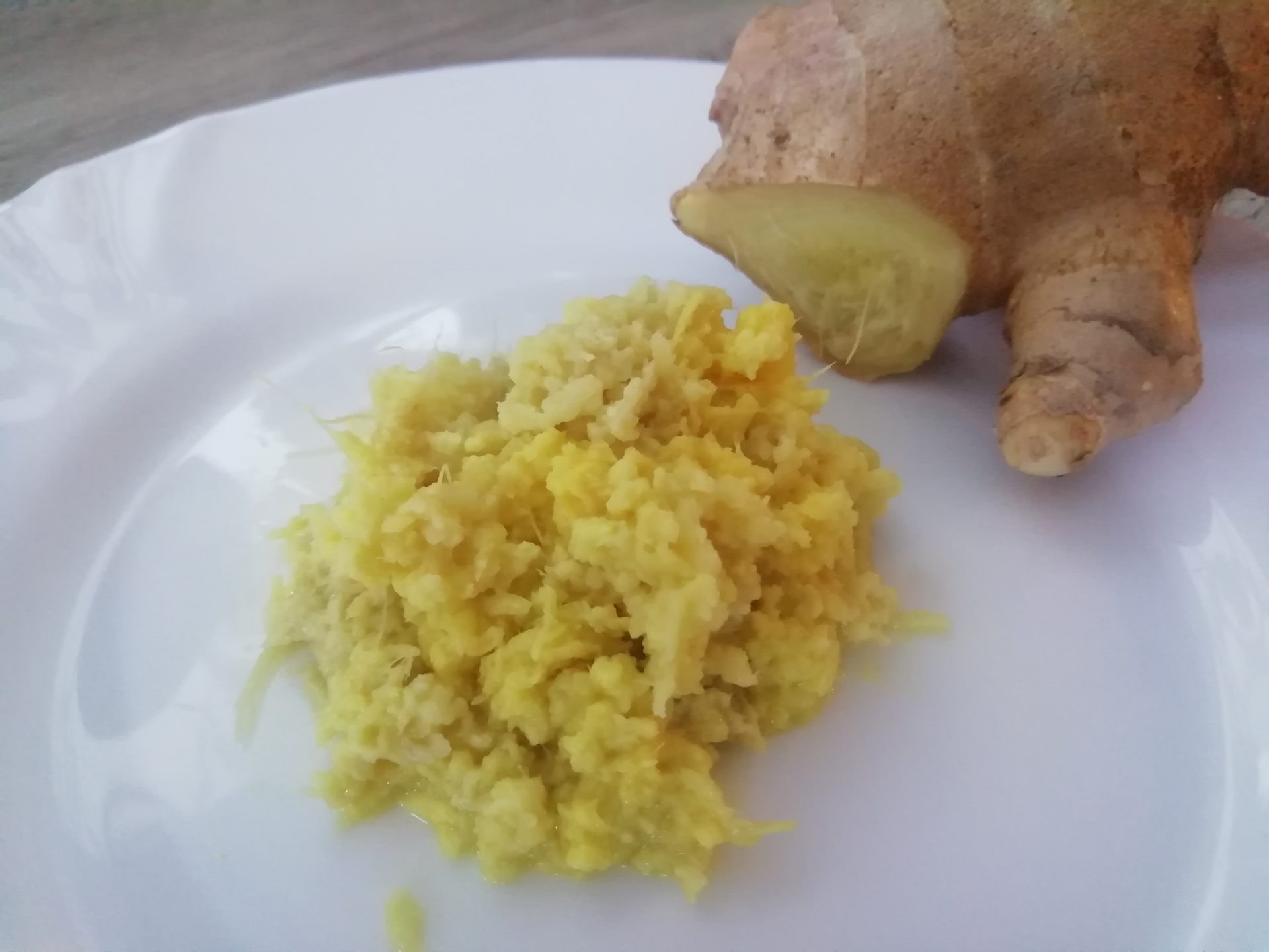 Użyj łyżki do oczyszczenia imbiru. Następnie użyj moździerza lub tarki do rozdrobnienia imbiru.
