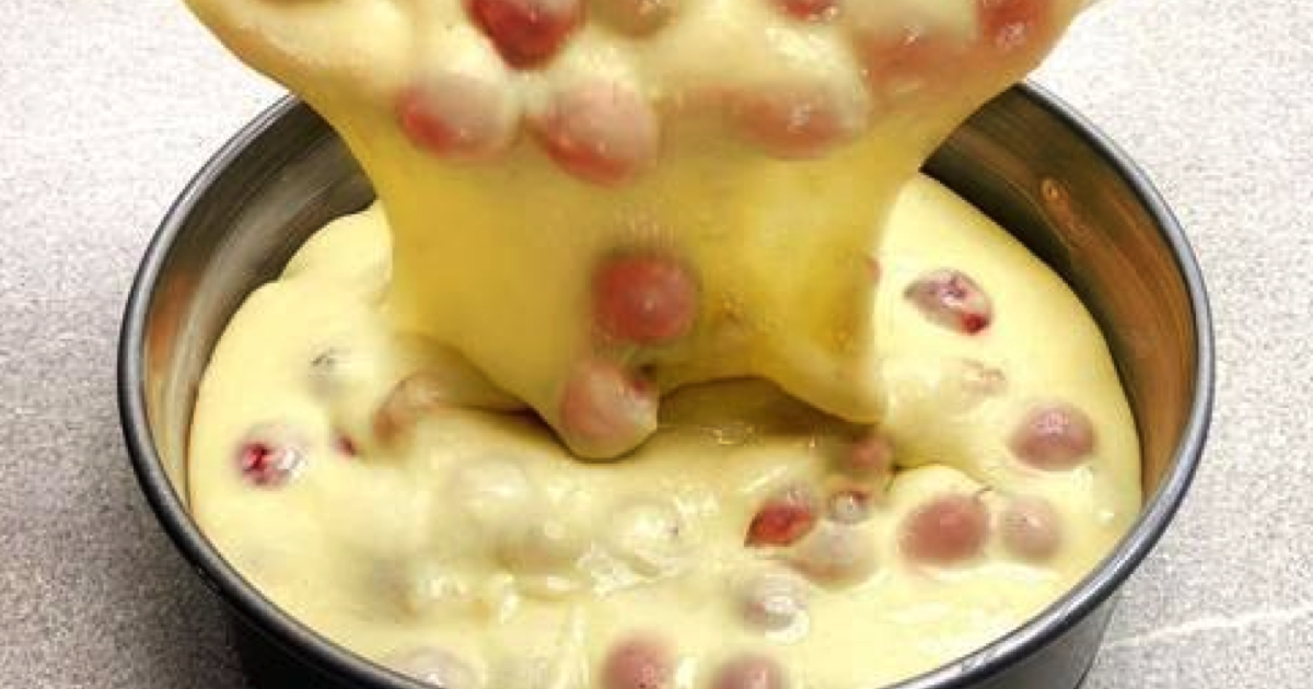 Do osobne miski przesiej mąkę, proszek do pieczenia. Wsyp do płynnych składników i razem wymieszaj. Formę o średnicy 22-24 cm wysmaruj tłuszczem, posyp lekko mąką i wylej na to ciasto. Następnie ułóż owoce. Piecz przez 35 min. w 180 st. C.