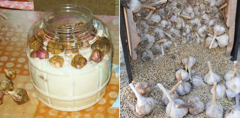 Jedną z bardzo skutecznych metod jest przechowywanie czosnkowych główek w dużym, słoju, w warstwach przesypanych produktem o właściwościach higroskopijnych (pochłaniających wilgoć). Może to być gruba sól, ryż, mąka, trociny.