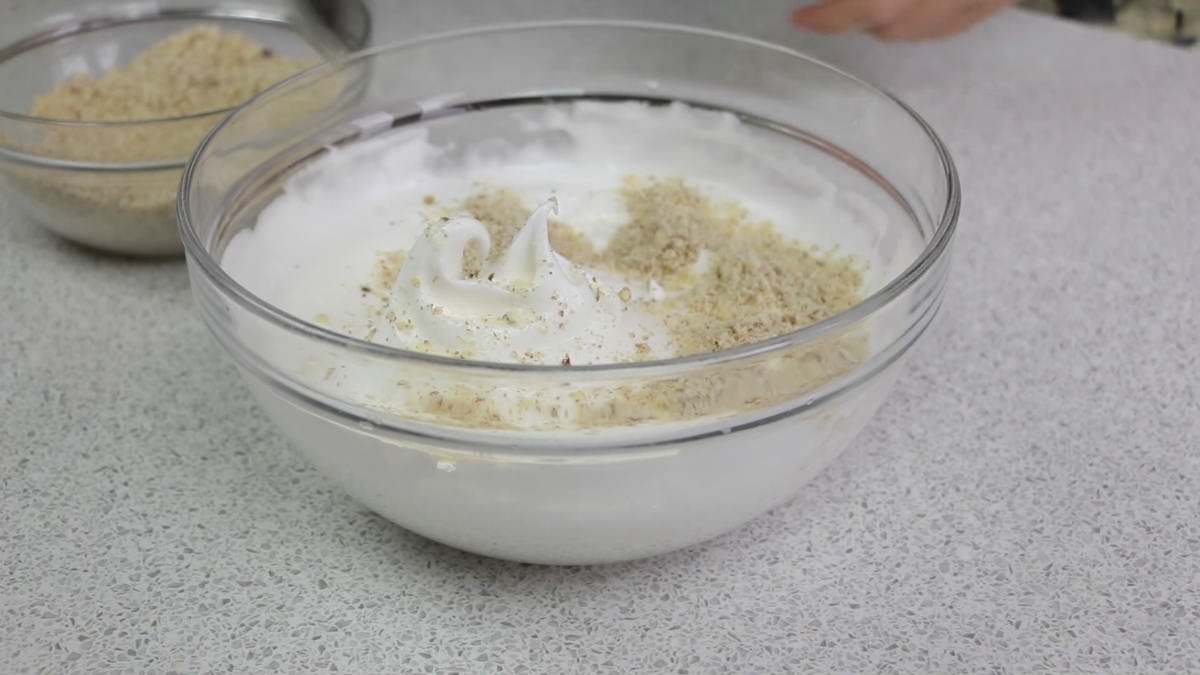 Białka należy ubić na sztywną pianę ze szczyptą soli, dodać powoli cukier i kontynuować ubijanie. Kolejnym krokiem jest dodanie mąki oraz orzechów i wymieszanie całości aż do uzyskania jednolitej masy.