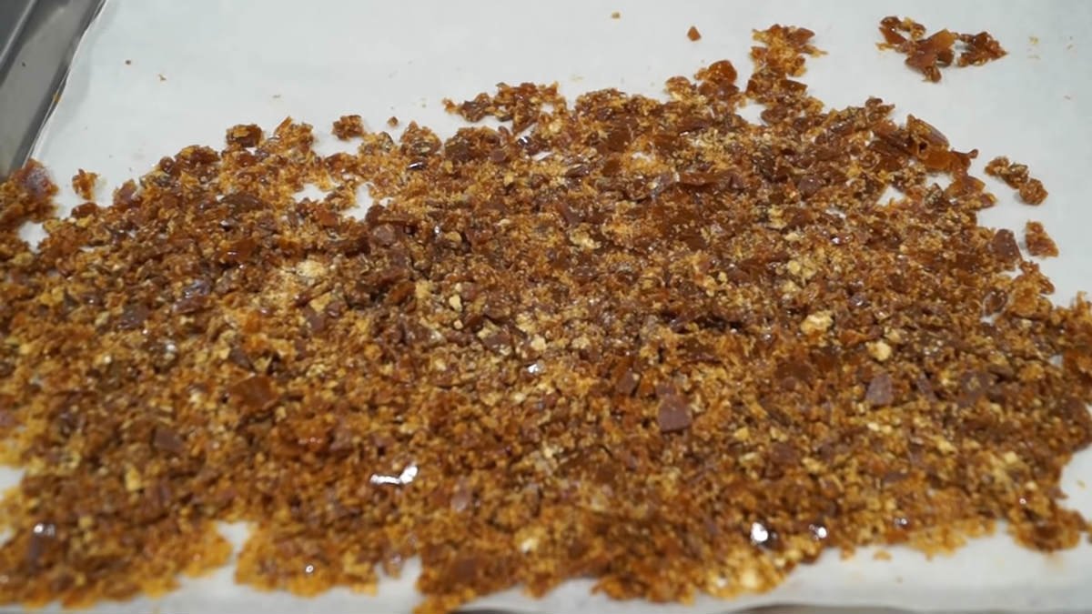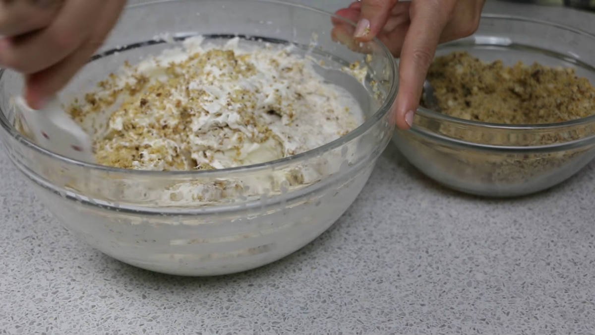 W rondlu karmelizujemy pozostały cukier. Należy wylać go na pergamin i przykryć kolejną warstwą i poczekać aż stwardnieje. Następnie trzeba pokruszyć, na przykład przy pomocy wałka, cukier na małe kawałeczki. Do ubitej na sztywną pianę śmietany kremówki dodać należy pokruszony karmelizowany cukier i pozostałe posiekane orzechy.