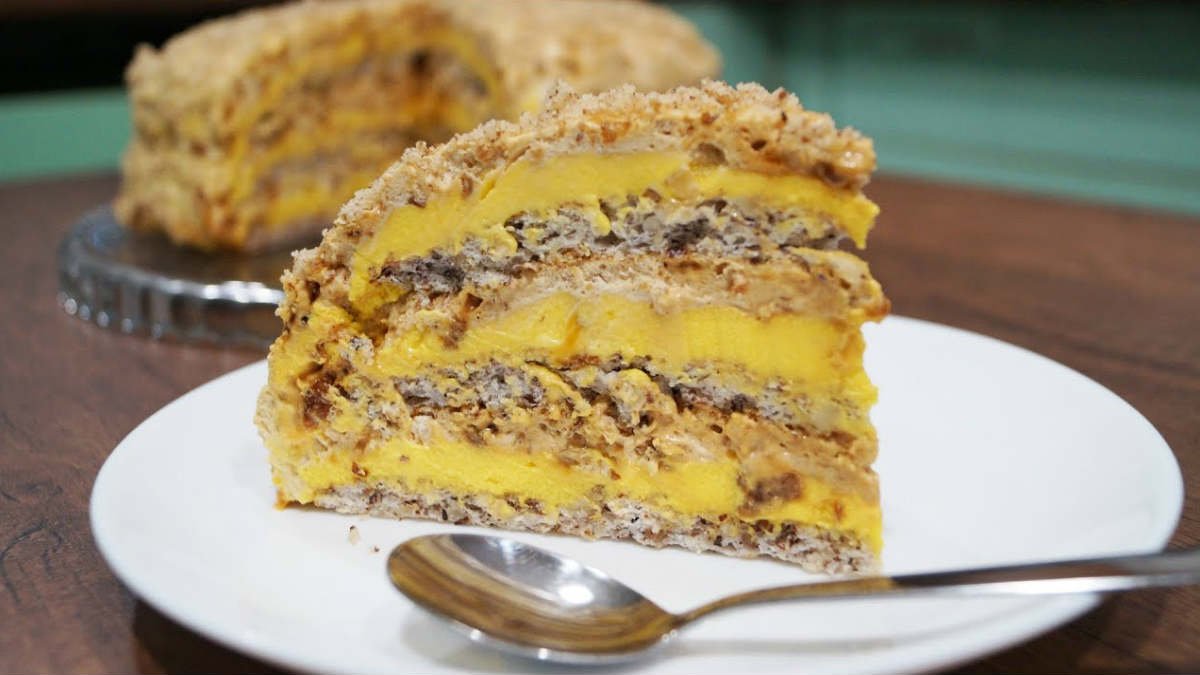 Na paterze należy ułożyć pierwszy blat ciasta i przełożyć go kremem i karmelem z orzechami. Czynność powtórzyć jeszcze dwa razy, by na samym wierzchu ciasta znalazł się karmel z orzechami.