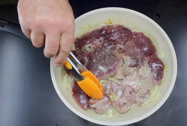 Na tym etapie nie dodajemy żadnych przypraw, w szczególności soli, która spowodowałaby to, że wątróbka byłaby twarda. Po około 1-2 minutach kawałki przekręcamy na drugą stronę i smażymy tyle samo czasu.