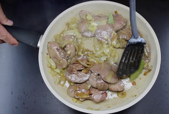Kiedy wątróbka zacznie bieleć, dodajemy liście laurowe. Wszystko podsmażamy jeszcze około minutę i odstawiamy z gazu. Przed jedzeniem wątróbkę doprawiamy wedle uznania. Gotowe.