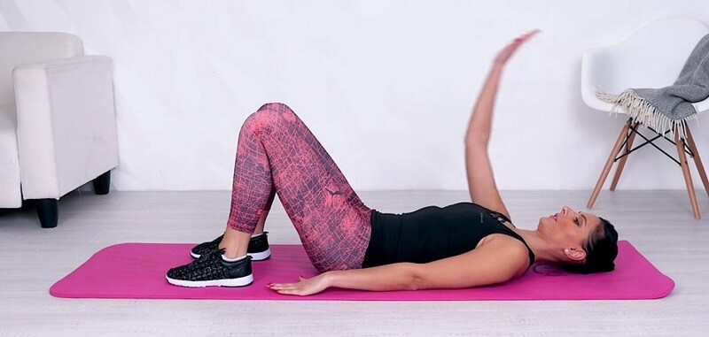 Połóż się wygodnie na plecach i zegnij kolana. Wykonaj wdech. W jego trakcie podnieś rękę, a następnie, podczas wydechu, opuść ją do pozycji początkowej. Wykonuj ćwiczenie, przeznaczając po 30 sekund na każdą rękę.